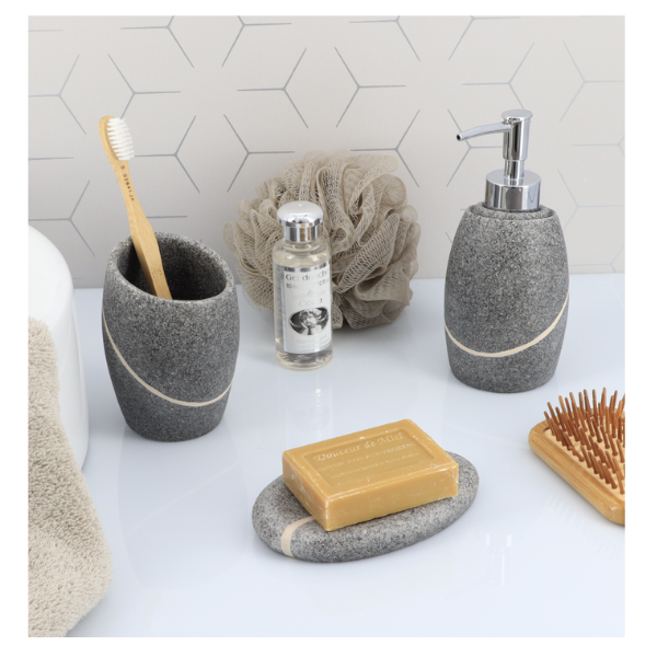 Praktična kupaonska čaša MALUA ima estetski dopadljiv dizajn koji se uklapa u svaku kupaonicu, a univerzalna namjena znači da ju možete koristiti za ispiranje ustiju nakon pranja zubi, držanje četkica za zube ili kozmetičkih kistova. Nijanse sive suptilno naglašavaju oblik proizvoda, što u kombinaciji s originalnim dizajnom i bijelom crtom na sredini daje jedinstven učinak. Izrađena od kvalitetnog poliresina. Dimenzija: 7,2×6,5×9,8cm.