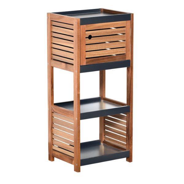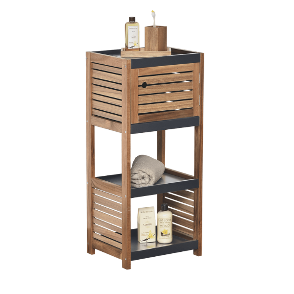 Kupatilski ormarić smeđe boje sa tamno sivim policama. Inovativnog dizajna pruža mnogo prostora za pohranu svih kupanskih potrepština. Ima 3 razine od čega jedna ima vrata. Izrađen od kvalitetnog acacia MDF materijala.