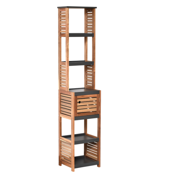 Kupatilski ormarić inovativnog dizajna nije samo praktični, već i dekorativni element. Sastoji se od 5 otvorenih polica te jedne police s vratima. Izrađen od kvalitetnog acacia MDF materijala. Smeđe boje sa tamno sivim policama.