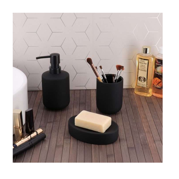 Stilska čaša od stoneware keramike s mat gumenim efektom u crnoj boji. Visina: 10 cm; promjer: 7 cm. Idealna za četkice za zube ili kao dekorativni detalj.